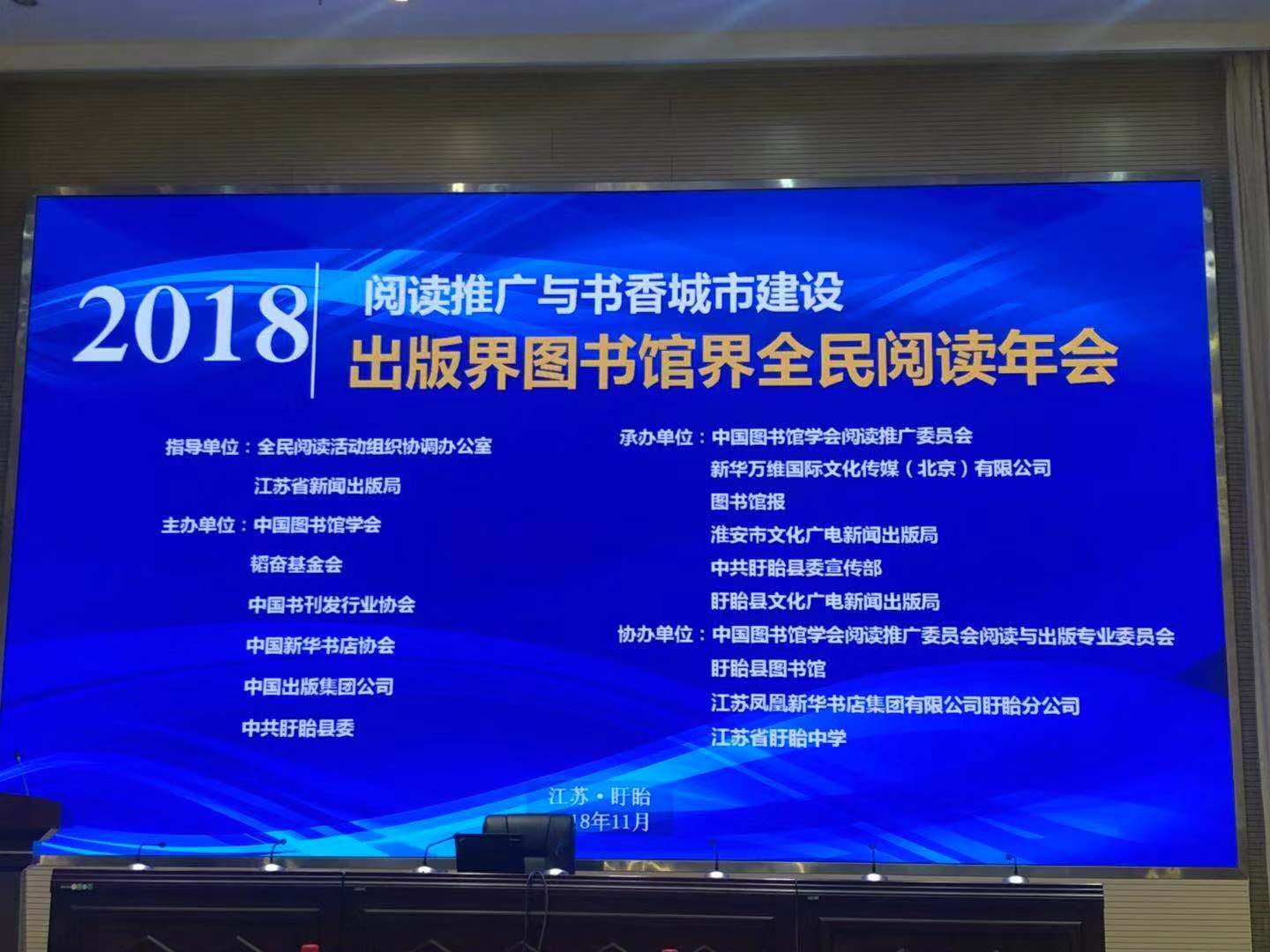11月23日,由中國圖書館學(xué)會、韜奮基金會、中國書刊發(fā)行業(yè)協(xié)會、中國新華書店協(xié)會、中國出版集團公司主辦的“2018出版界圖書館界全民閱讀年會”在江蘇盱眙舉辦。本屆年會以“閱讀推廣與書香城市建設(shè)”為主題,邀請出版界、發(fā)行界、圖書館界200余位嘉賓出席,為推進全民閱讀建言獻策。