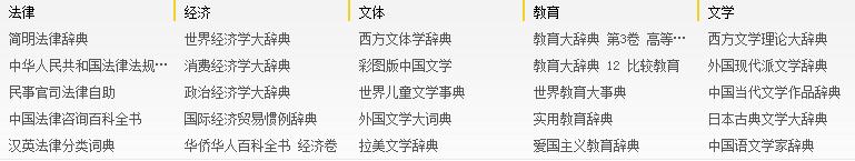 主要收錄國(guó)內(nèi)各大出版社各個(gè)領(lǐng)域的權(quán)威工具書(shū),目前已經(jīng)收錄了《中國(guó)大百科全書(shū)》、《漢語(yǔ)大詞典》、《辭?!返葯?quán)威工具書(shū);
